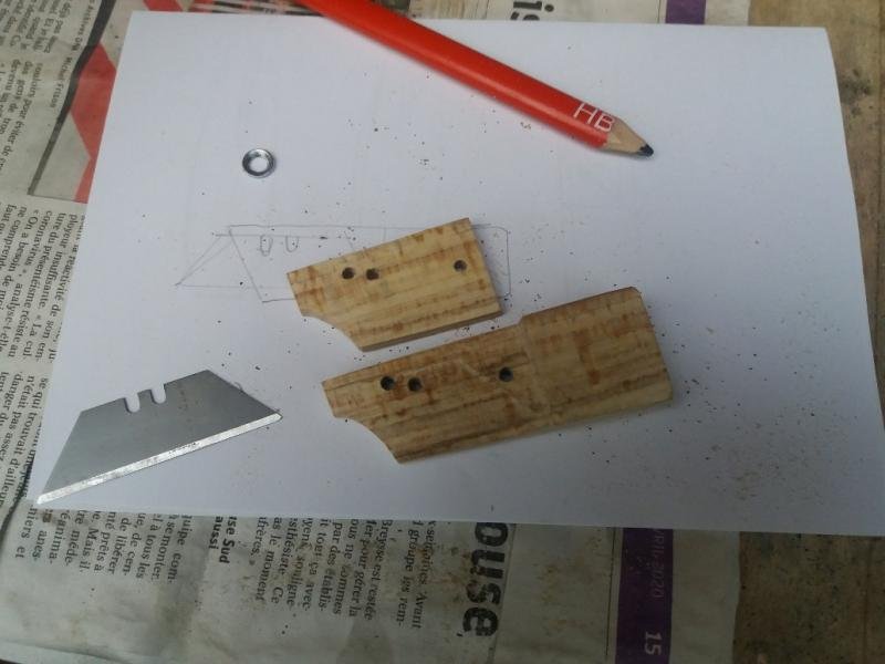 Donc voilà rien de très complexe, scier le bois en deux sur une partie seulement, creuser un peu l'emplacement de la lame, percer pour pouvoir mettre des vis de manière à pouvoir changer la lame. Je n'ai pas eut besoin de beaucoup d'outils: