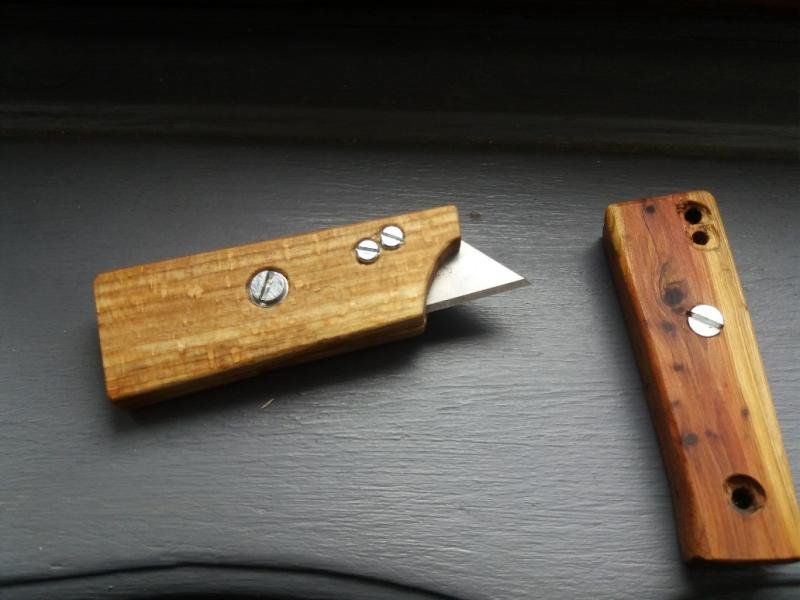 J'ai un cutter avec lame rétractable, mais il a du jeu, ce qui est un peu désagréable à l'usage. J'ai donc essaye de m'en faire un en bois. J'ai de jolis bouts de bois, c'est du résineux, mais pas d'une espèce locale, le coeur est rouge et très dur, l'aubier est très mou et blanc. Il sent bon quand on le coupe.