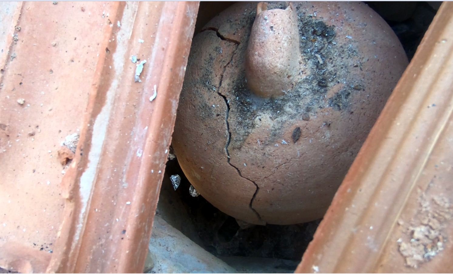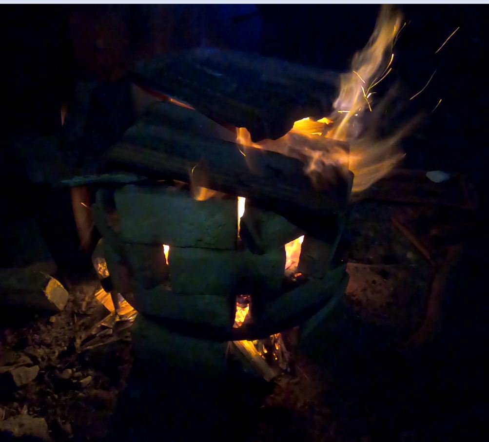 non, cuite en extérieur dans four bricolé, une grille quelques briques et tuiles au dessus :
