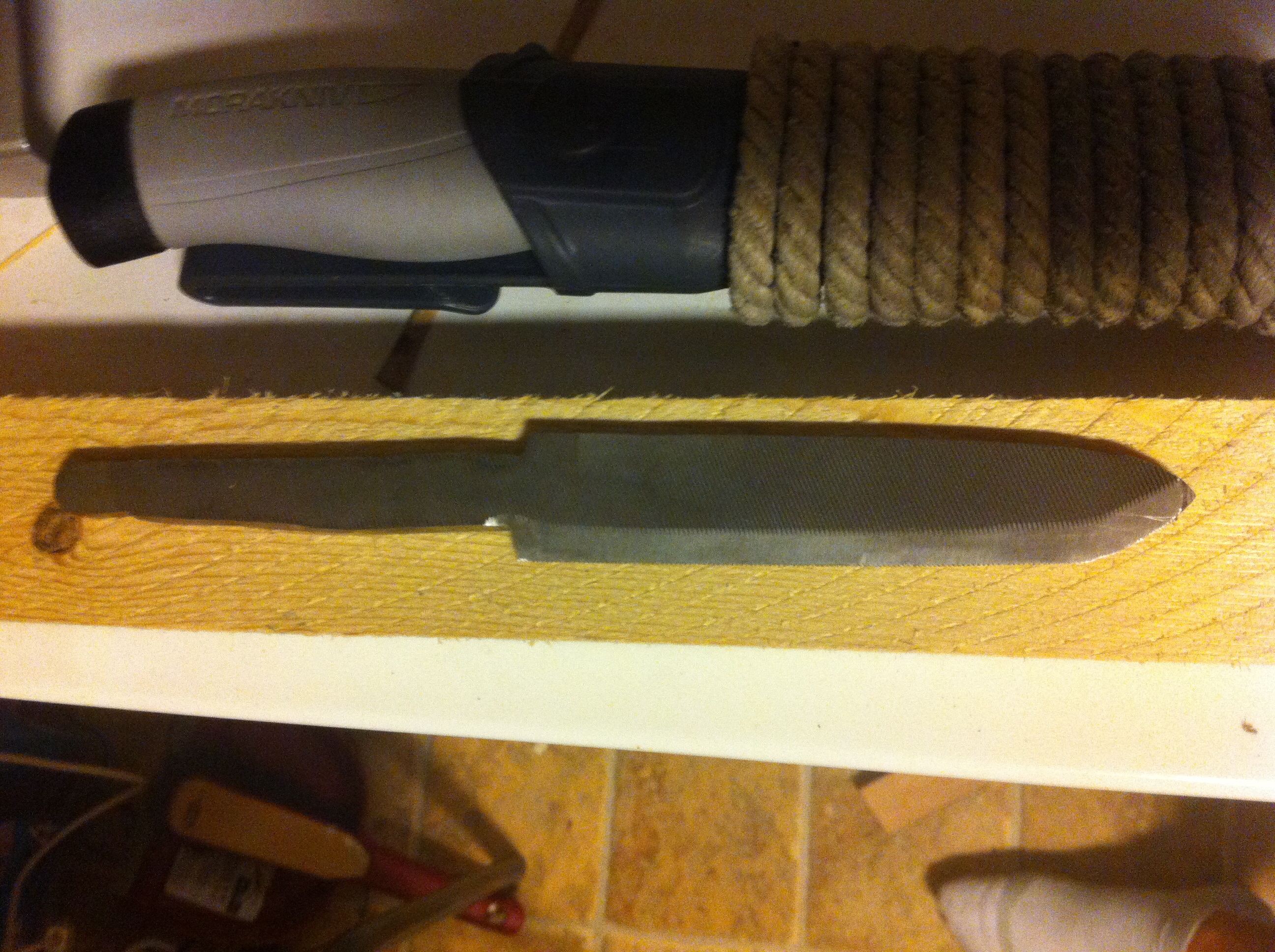 Si tu termine ta lame telle qu' elle est, comme tu l'a chauffé à la meuleuse sur le tranchant, celui ci a perdu une grande partie de sa dureté. Par contre, comme le traitement thermique d'une lime est tres différent de celui d'une lame, le dot de ton couteau sera toujours tres cassant (comme le sont les limes).